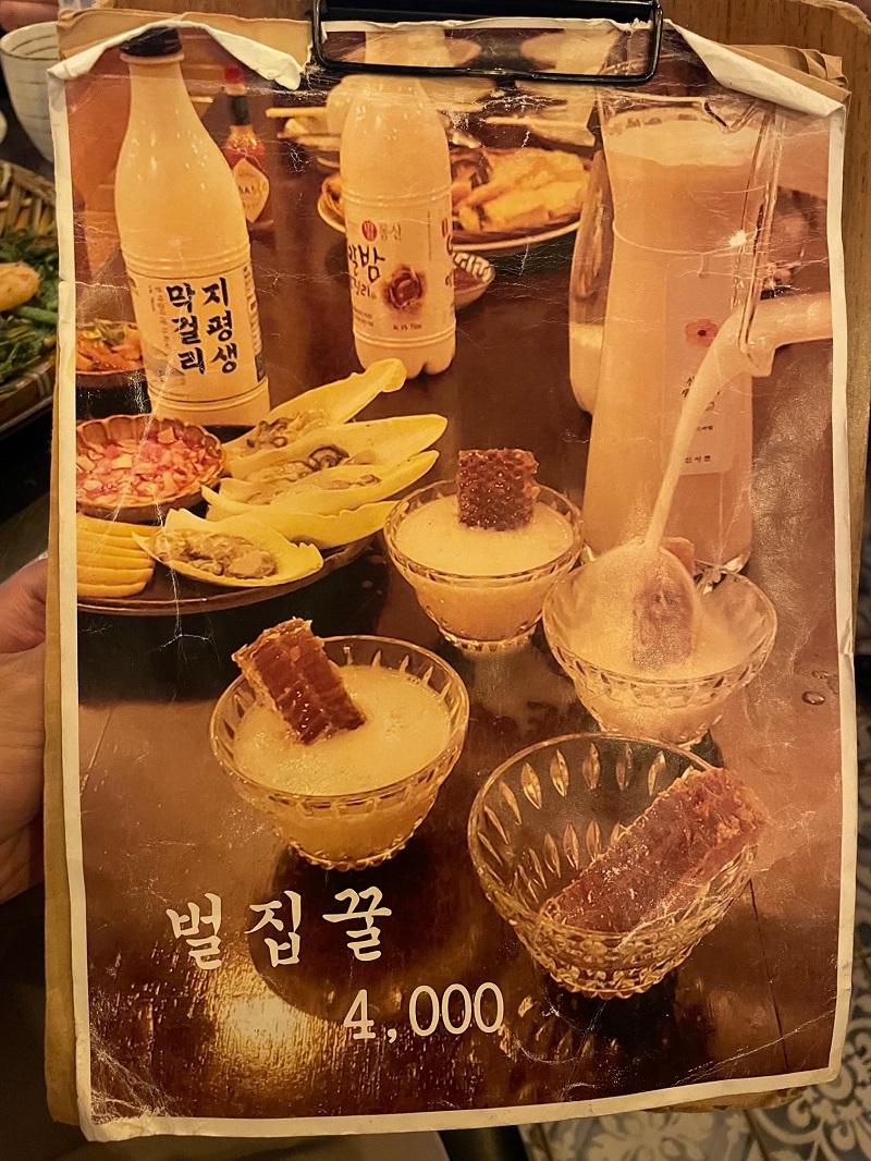 벌집꿀을 넣은 잔에다가 신사동 생막걸리를 넣어먹으면